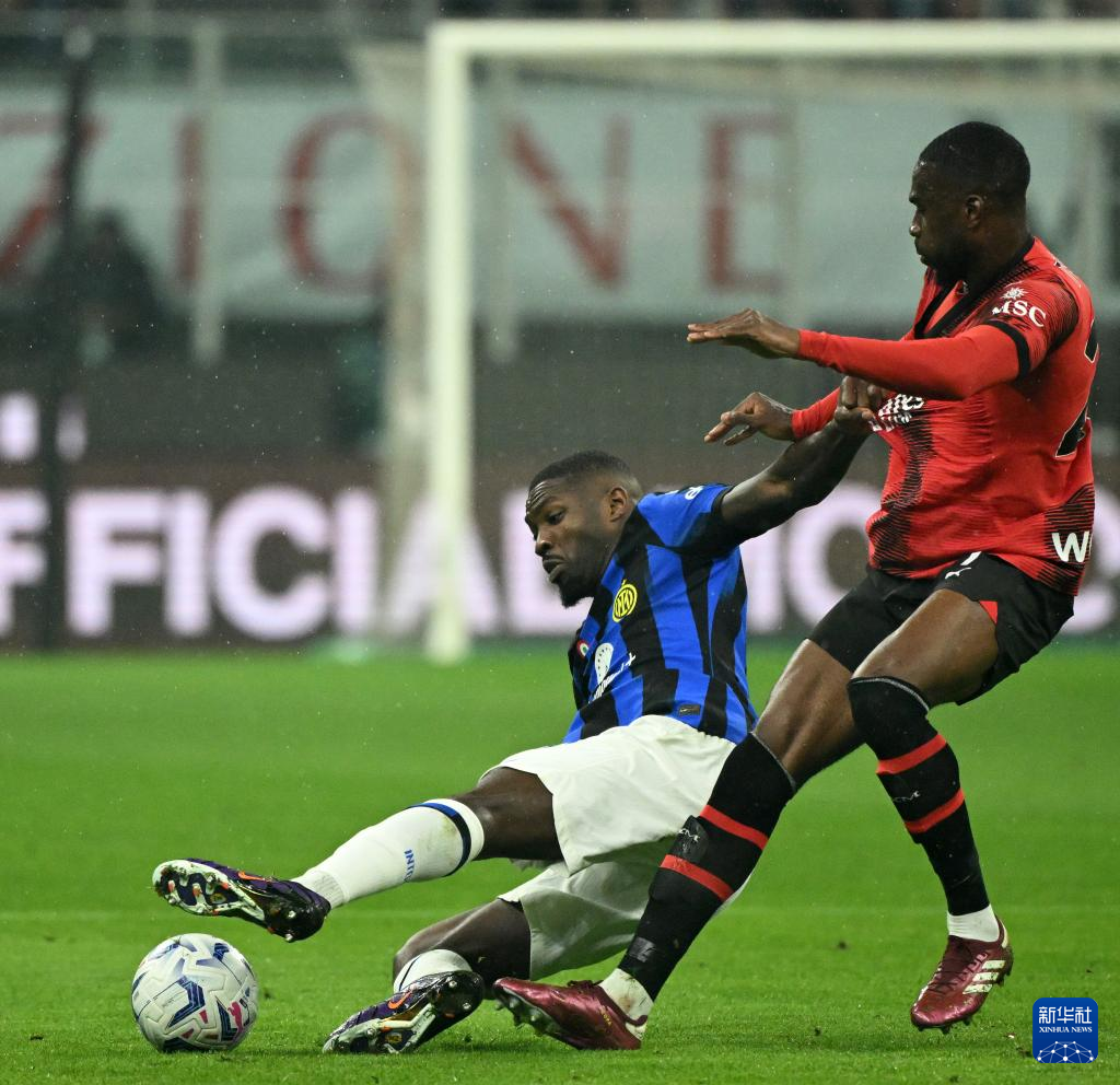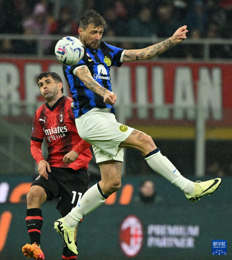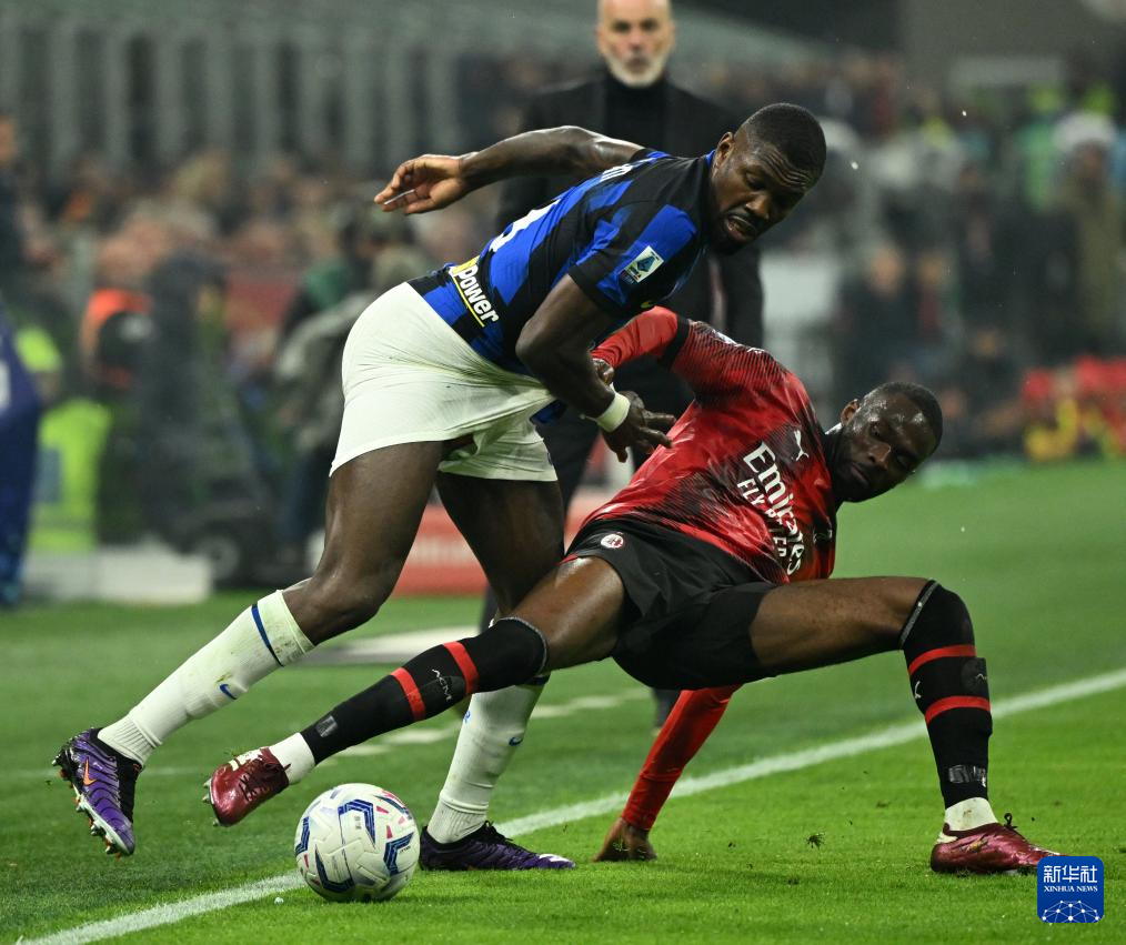 4月22日,國際米蘭隊球員阿切爾比(右)與AC米蘭隊球員普利希奇在比賽中拼搶。新華社發(fā)(阿爾貝托·林格利亞攝)