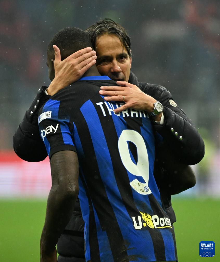 4月22日,國際米蘭隊主教練西蒙尼·因扎吉(后)與球員圖拉姆慶祝。新華社發(fā)(阿爾貝托·林格利亞攝)