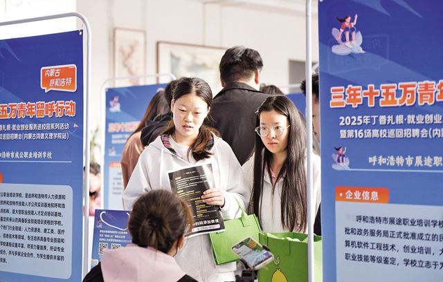 10月12日,求職者在招聘會上向心儀企業(yè)認(rèn)真詢問崗位要求。當(dāng)日,2025年呼和浩特市丁香扎根·就業(yè)創(chuàng)業(yè)服務(wù)進校園系列活動走進內(nèi)蒙古鴻德文理學(xué)院,60家企業(yè)提供2068個就業(yè)崗位。今年呼和浩特市已舉辦各類校園專場招聘會16場,入校送崗4.6萬個,服務(wù)高校學(xué)子3萬余人。草原云·正北方網(wǎng)記者 楊林枝 攝
