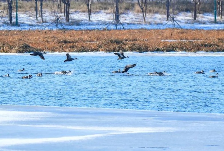 三九寒天,氣溫降至零下十幾度,通遼大地冰封雪裹,滴水成冰。可記者走進位于開發(fā)區(qū)的通遼生態(tài)植物園,卻遇見一幅別樣的冬日生機圖:園區(qū)濕地多數(shù)區(qū)域未被冰雪封凍,水面氤氳著淡淡白汽,數(shù)十只野鴨為主的水鳥或成群游弋,或振翅掠水,打破了北方冬日的蕭瑟,成為嚴(yán)寒里最靈動的風(fēng)景。