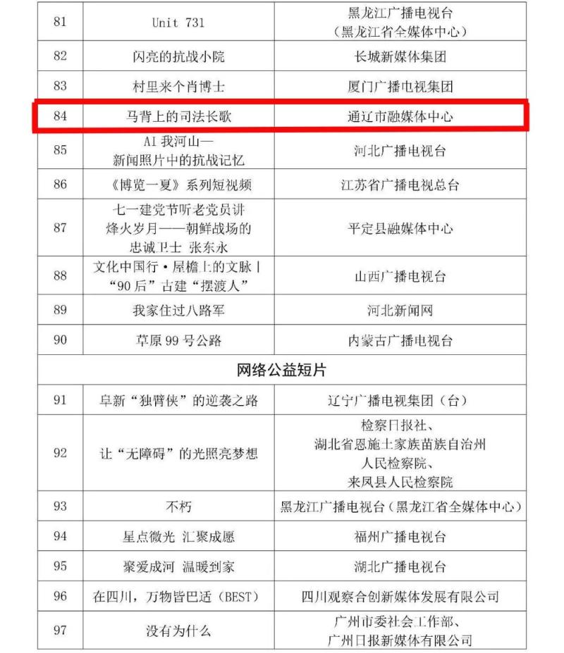 1月15日,國(guó)家廣播電視總局公布 2025 年第三季度優(yōu)秀網(wǎng)絡(luò)視聽(tīng)作品推選活動(dòng)評(píng)審結(jié)果。其中,內(nèi)蒙古廣播電視臺(tái) 2 件作品、通遼市融媒體中心 1 件作品入選,全區(qū)共3 件作品上榜。