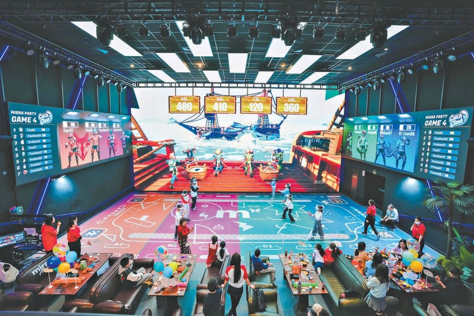主屏幕、左右側屏和天幕組成的四塊大屏變幻出絢麗光影,影廳變成了歡樂喧鬧的派對現場。場地中央的觀眾集結組隊,在游戲世界中展開釣魚、奪寶、打冰球等激烈對抗。觀眾席上的人也沒閑著,邊吃零食邊圍觀點評大屏上隊友的表現。位于耀萊成龍影城五棵松店的Mirra奇鏡派對融合廳,是全國首家巨幕沉浸影游空間。