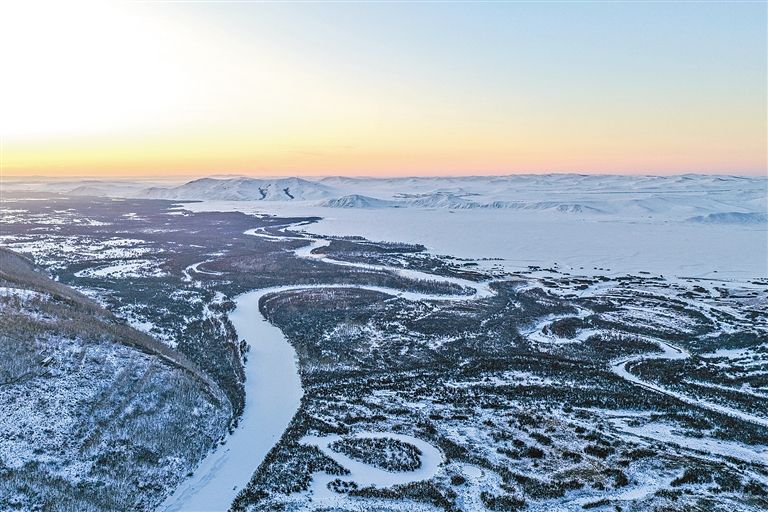 余暉映襯下的額爾古納濕地周邊被皚皚白雪覆蓋,與遠處銀裝素裹的山巒相映成趣,河流蜿蜒曲折,美景醉人。額爾古納濕地位于呼倫貝爾市額爾古納市境內(nèi),是中國保持原狀態(tài)最完好、面積較大的濕地之一,被譽為“亞洲第一濕地”。草原云·正北方網(wǎng)記者 王曉博 攝
