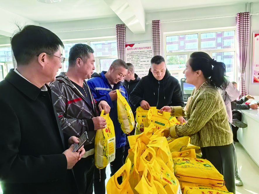 社區(qū)工作人員為居民發(fā)放米面  翟輝 攝